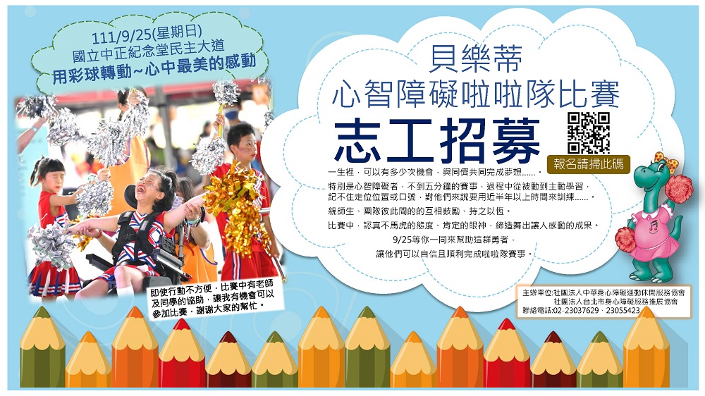 📣由本會與台北市身心障礙服務推展協會共同主辦之『第28屆貝樂蒂心智障礙啦啦隊比賽』,即日起受理一日志工報名個別志工線上報名。‼️防疫及報名資格請詳表單‼