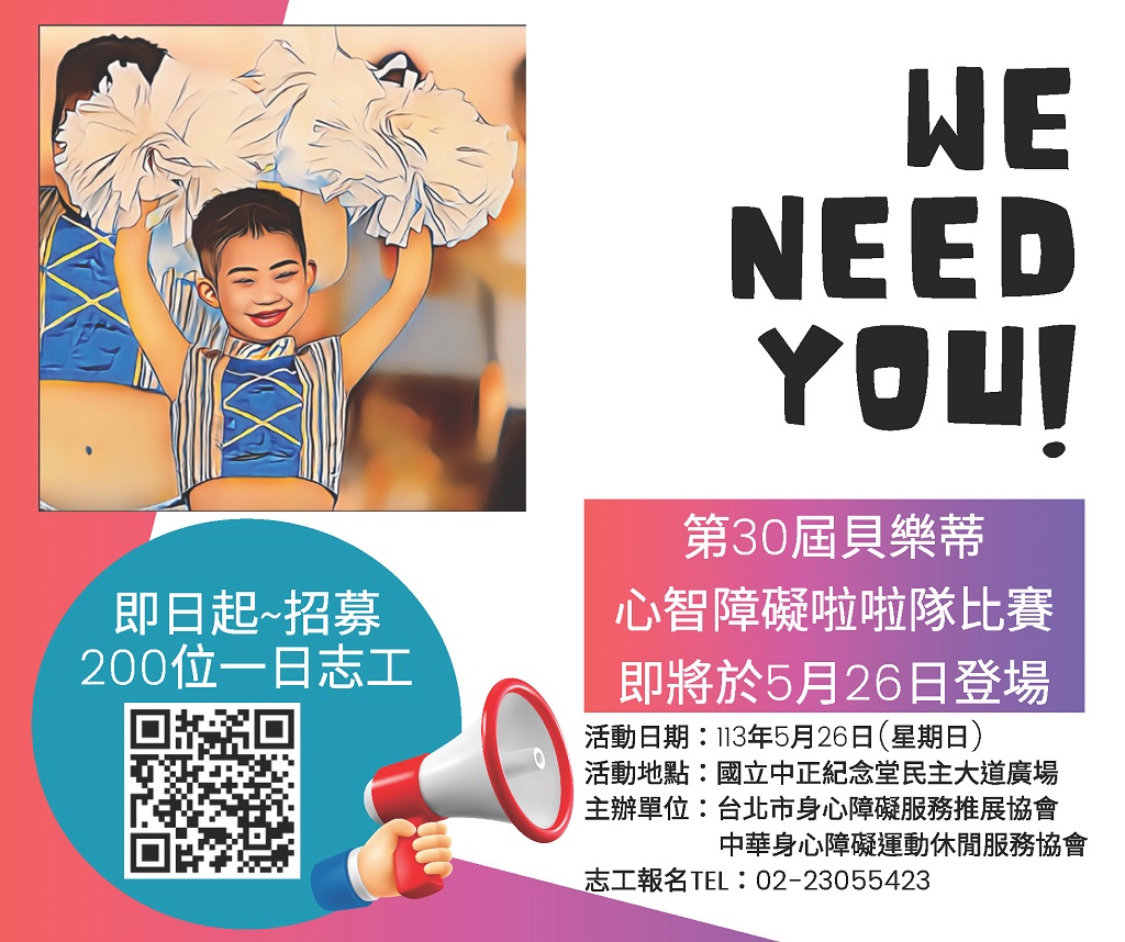 愛一直都在~現在需200位志工一起行動,加入服務行列,幫助貝樂蒂心智障礙啦啦隊比賽近350位的選手在舞台上展現自我,讓各個團隊的努力、自信的改變~被看見!