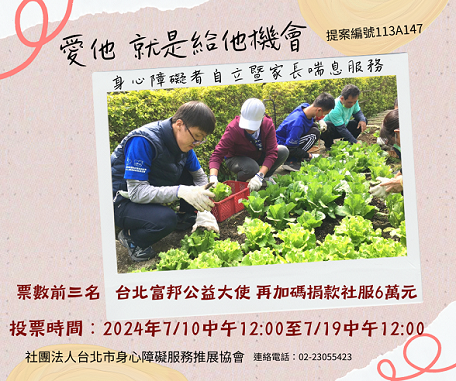 <分享>愛他 就是給他機會!請您幫忙投票,幫助身心障礙學員學習自立及家長喘息計畫,可以獲得富邦慈善基金會加碼補助捐款,台北市身心障礙服務推展協會進入前三名可獲得6萬加碼捐款!