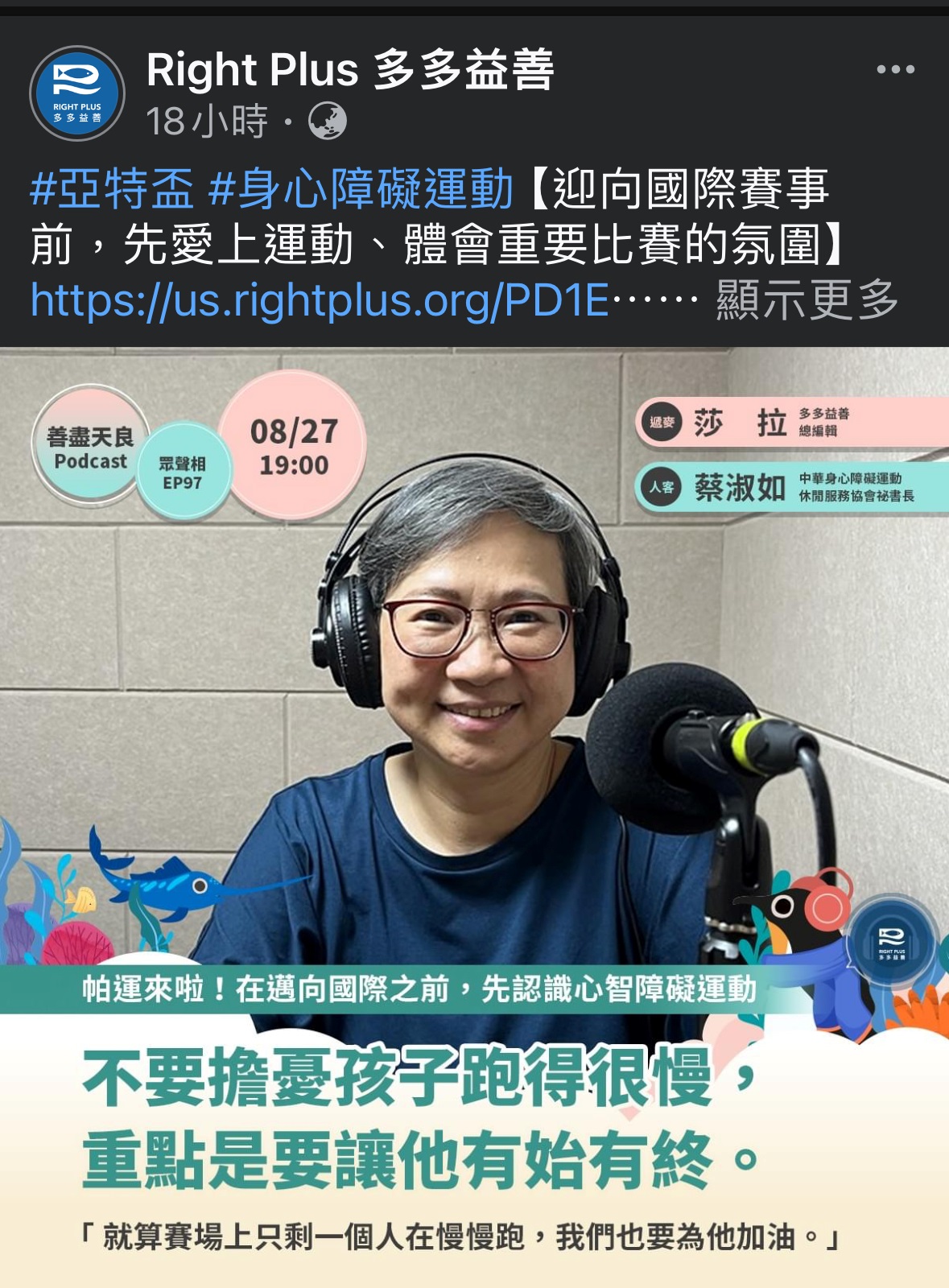 多多幫忙畫重點 ~ 一起來聽聽https://us.rightplus.org/PD1EP97協會的亞特盃心智障礙運動會、貝樂蒂心智障礙啦啦隊比賽……分享!